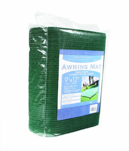 Camco Green RV Awning Leisure Mat measures 9 feet to 12 feet and cleans easily with soap and water. It is made of durable, mildew resistant materials, with rust resistant grommets and ground stakes included. This awning mat has a reversible woven design that allows snow and rain to drain through mat. It helps keep dirt from being tracked into your RV. Made of durable, mildew resistant materials Ru